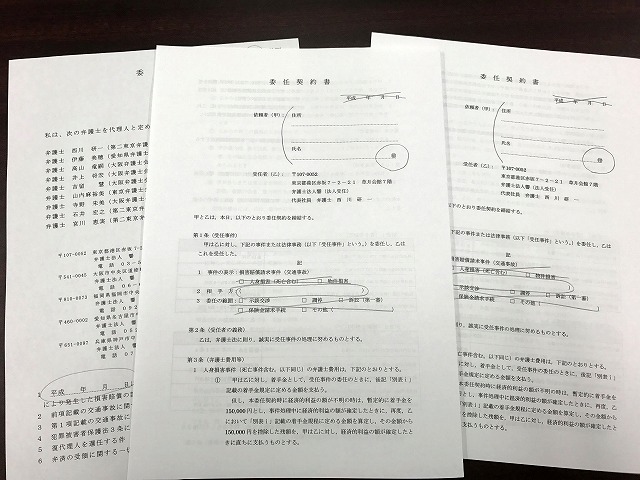 契約は特に難しいこともなく、簡単に終了です。その後の加害者とのやり取りは全て任せることができて助かりました。保険会社担当者とのラチの開かない話し合いは精神的にもかなり疲れるものでしたので。